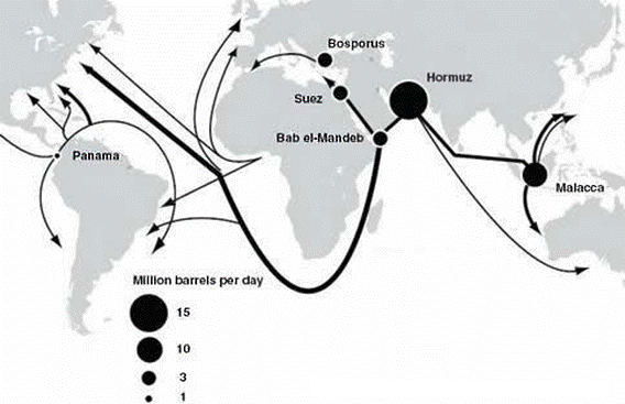 each chokepoint. Arrows represent common petroleum maritime routes.