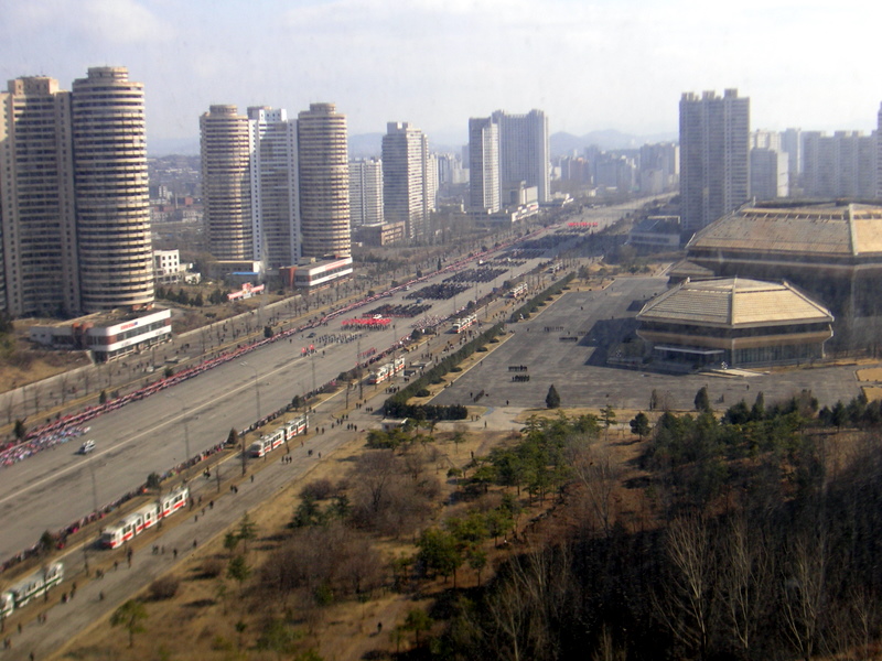 View from the 19th floor of the Chongnyon Hotel, Kwangbok Street, Pyongyang. University students march to celebrate their graduation, 31 March, 2006.