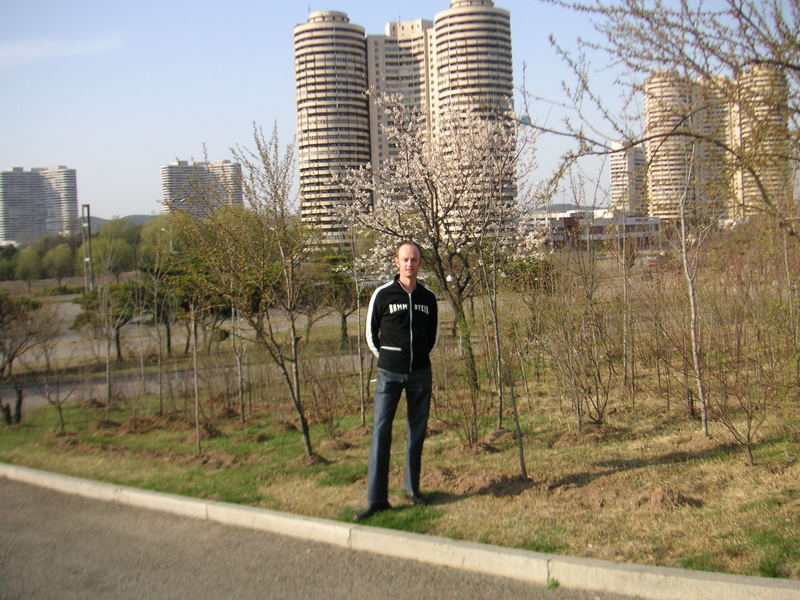 Standing beside the driveway of my hotel, on a beautiful Pyongyang Spring day, with Kwangbok St in the background. My hotel, and Kwangbok St, were built to coincide with the 1989 World Youth Games held in Pyongyang.