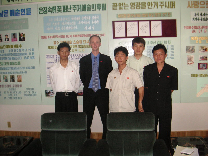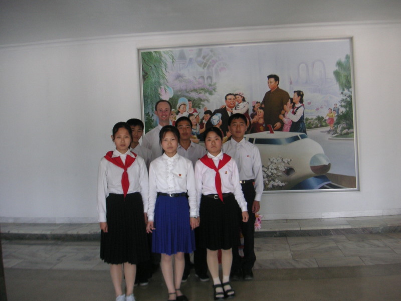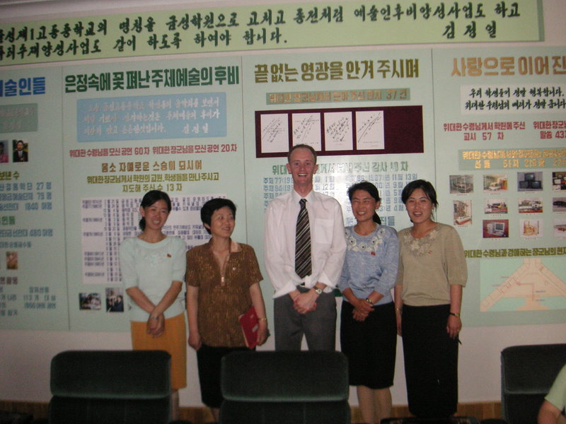 Tim Kearns, Hugh and Sarah Gollan and Sarah Drum with the Principal and music students of June 9 Taedong Middle School No. 1 (DPRK-NZ Friendship School) on the day of the 2nd anniversary of NZ Friendship Society ties with the school. The students sang, danced and gave us a tour of the school. This is one of the three schools I taught at