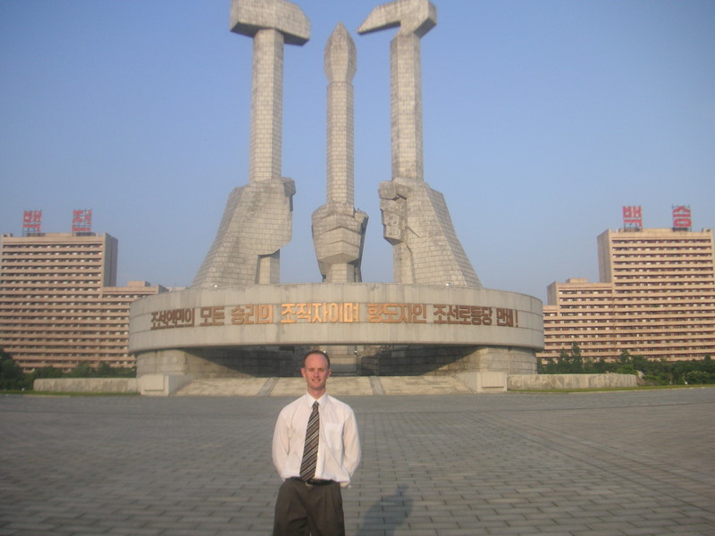In front of the Tower of the Juche idea during a late afternoon stroll in central Pyongyang.